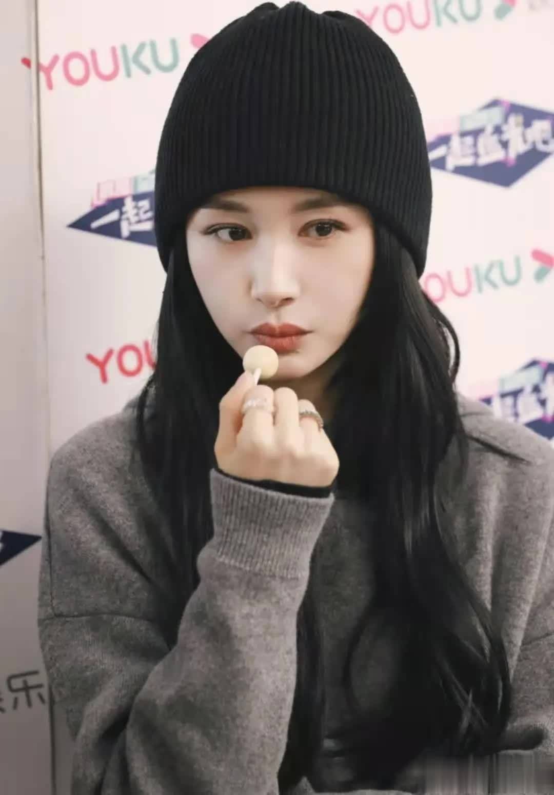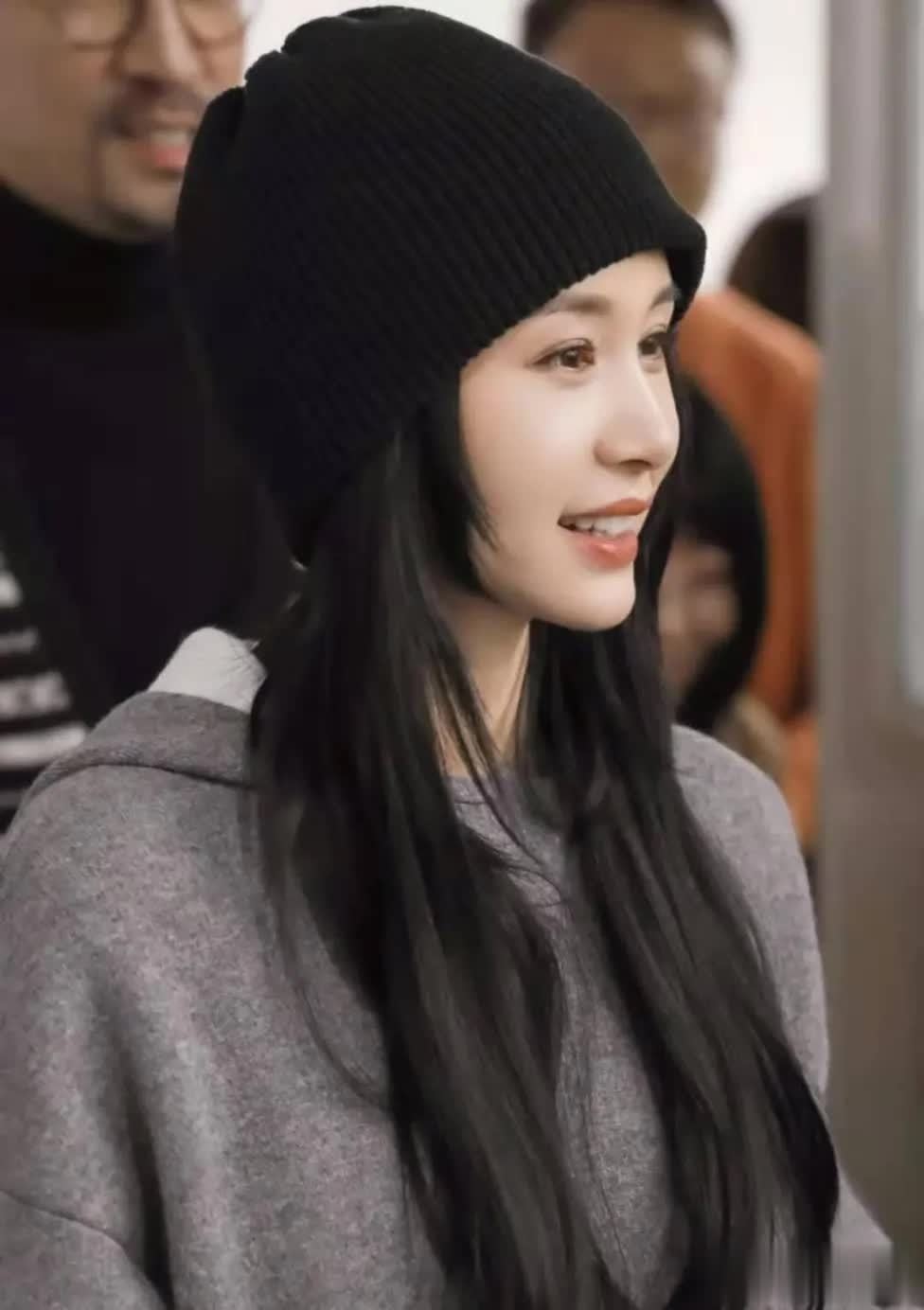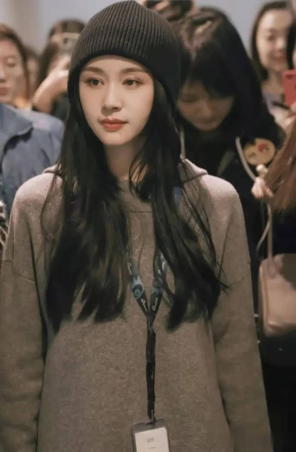 头上的针织帽采用纯黑色面料,此颜色可驾驭各种场合,在搭配衣服方面也颇为省心。冬天戴针织帽时,若担心耳朵冷,可将帽子边缘的面料往下拉一点。平日里戴针织帽时,常见的发型便是披发、低马尾,这两种发型都不费时间。
