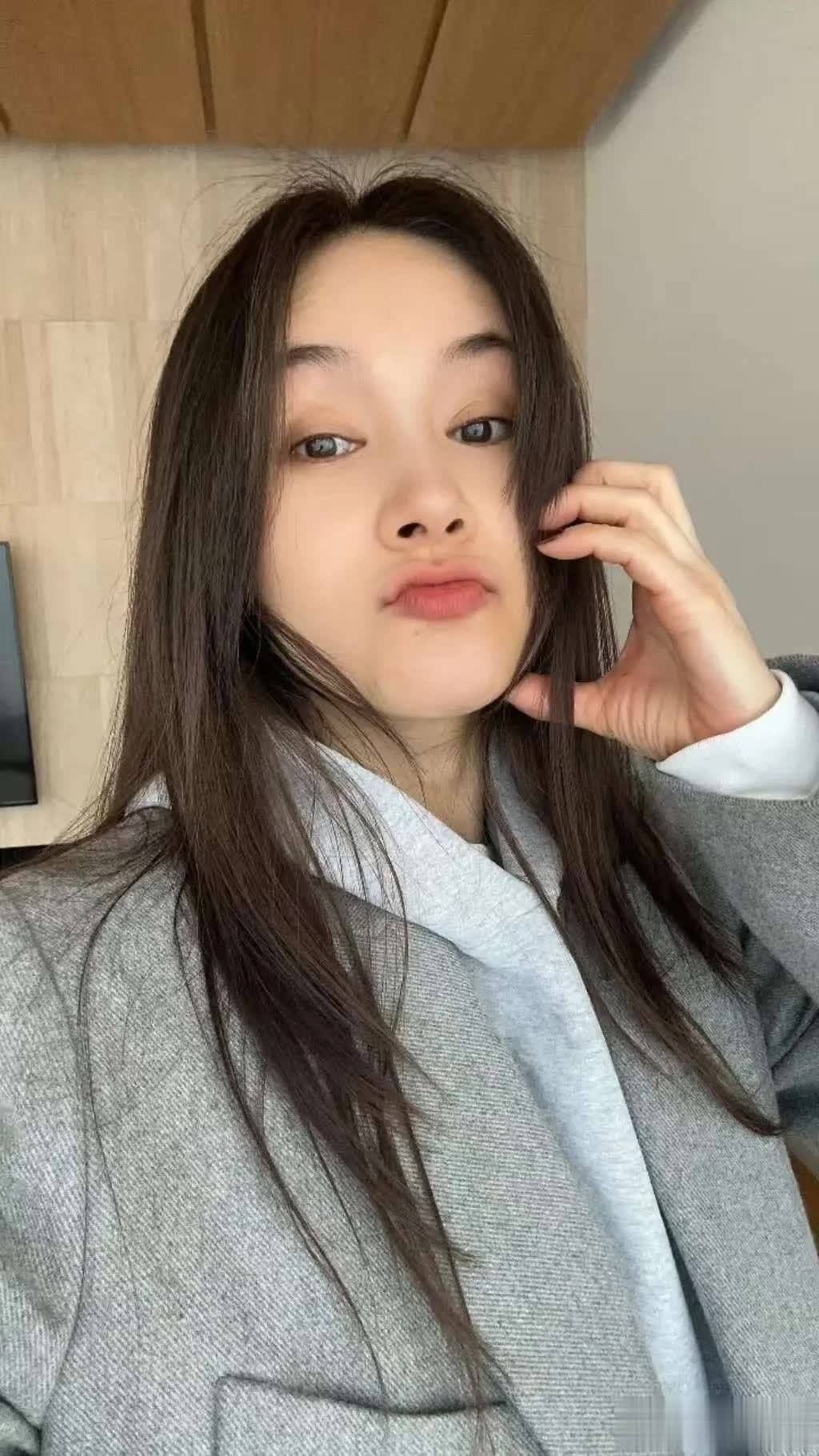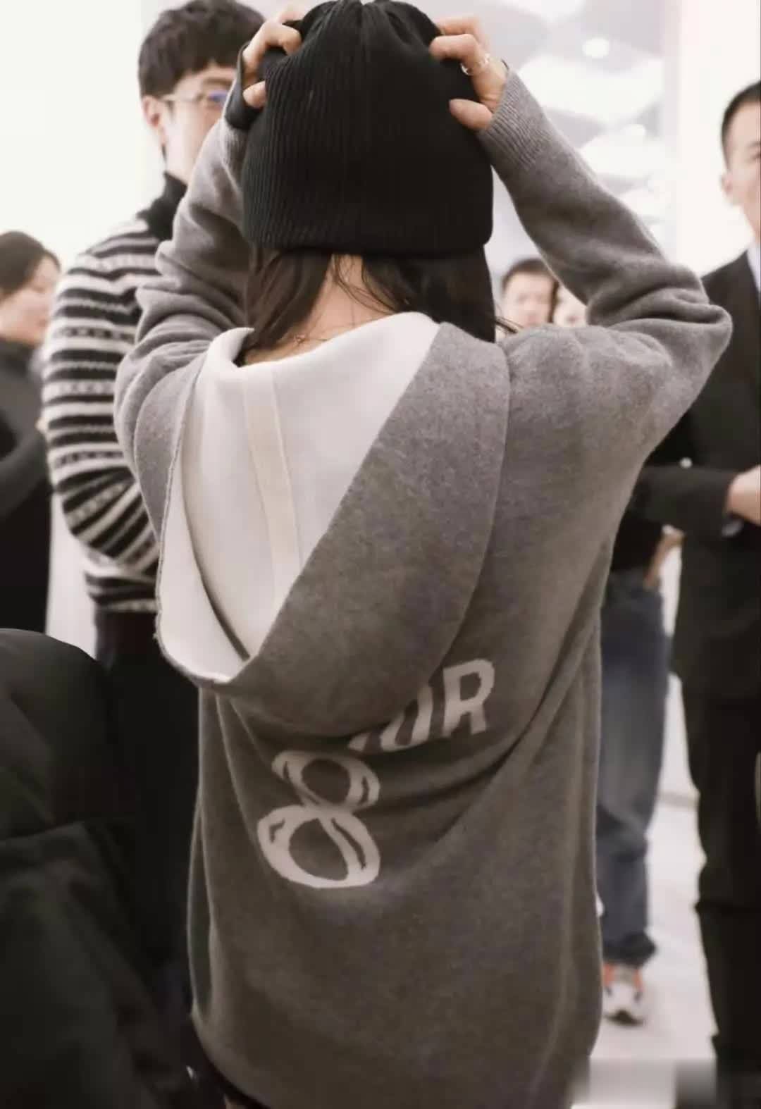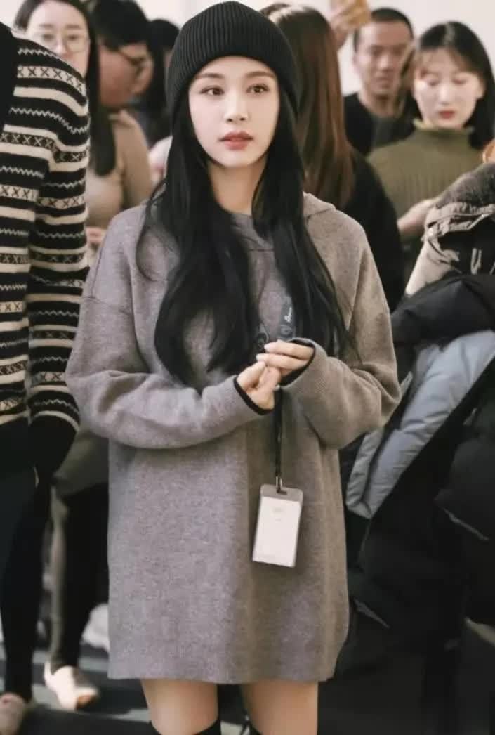 经过观察,上半身极有可能穿了三件。领口、衣摆处都能看到白色面料。灰色卫衣夹在中间,无法看出里层是否加绒。灰色卫衣依旧具备百搭特点,短款设计最为流行,毕竟人人都渴望拥有大长腿。腿上裤子依旧是灰色面料,大腿处松量较多,那么大腿根即便有肉肉,也不会被看到。